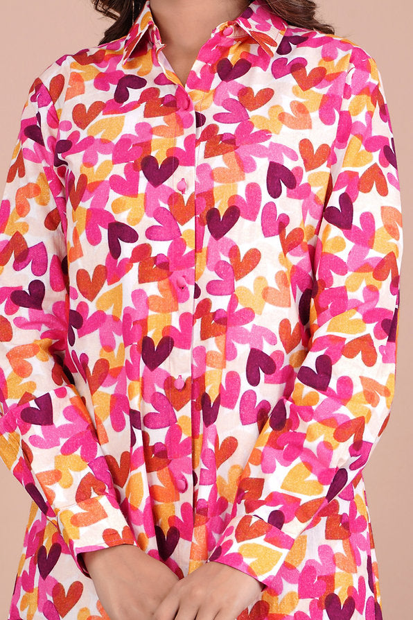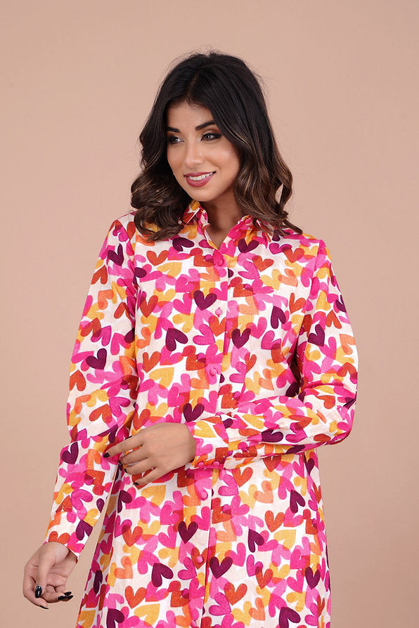 Elevate your style with our Heart Print Blossom Shirt Dress. Made with love and sustainability in mind, this adorable dress combines fashion and eco-consciousness. Embrace the charm of hearts while reducing your environmental footprint in this must-have piece from our sustainable clothing brand.