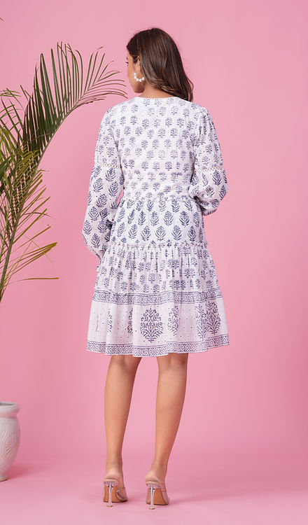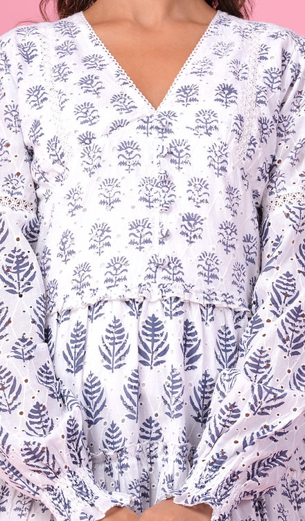Introducing the White and Blue Schiffli Dress from Mayin. Made from 100% cotton, it features delicate blue embroidery, a V-neck, and full sleeves, all in a knee-length silhouette. Ethically crafted, it embodies timeless elegance with a sustainable touch.