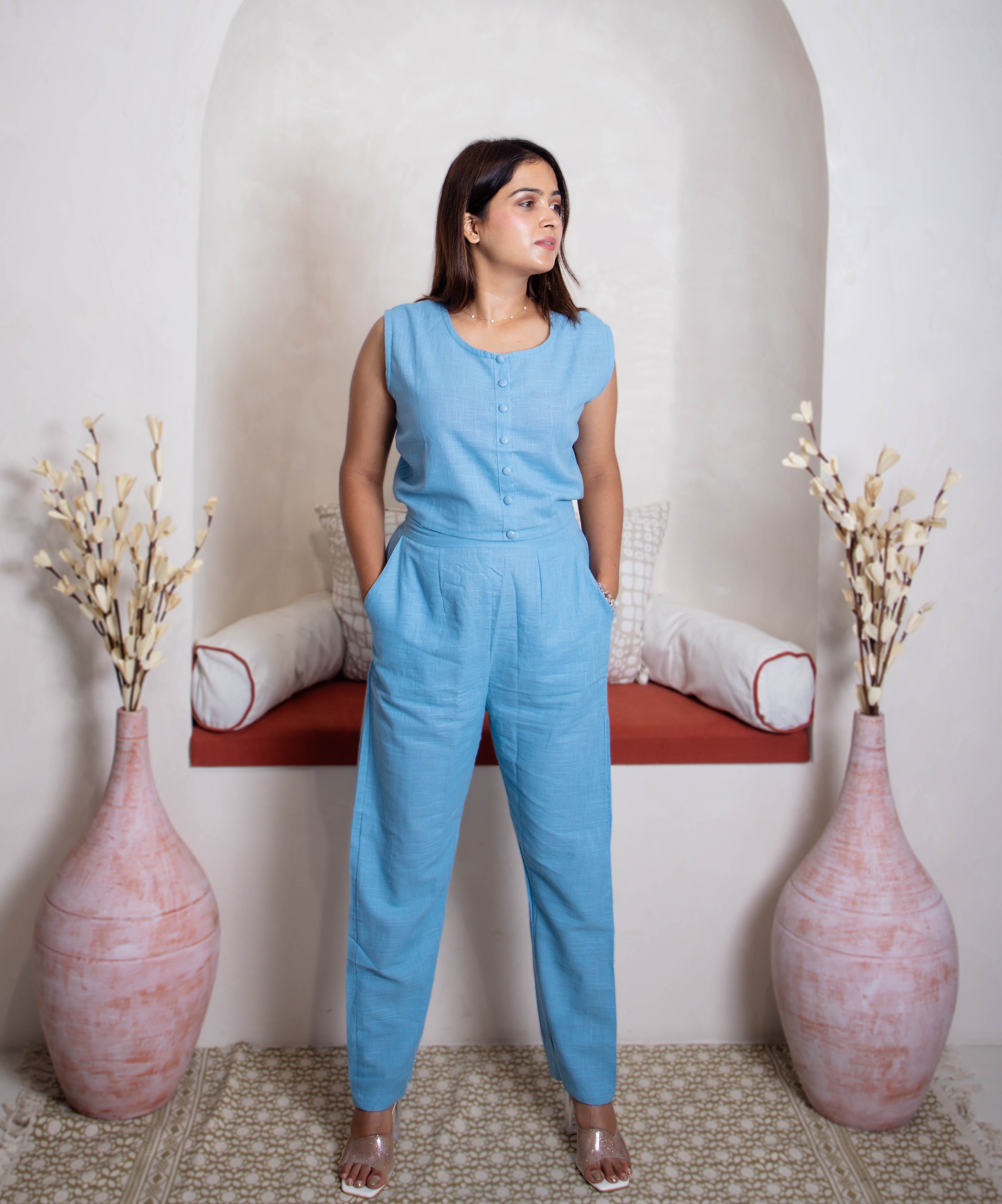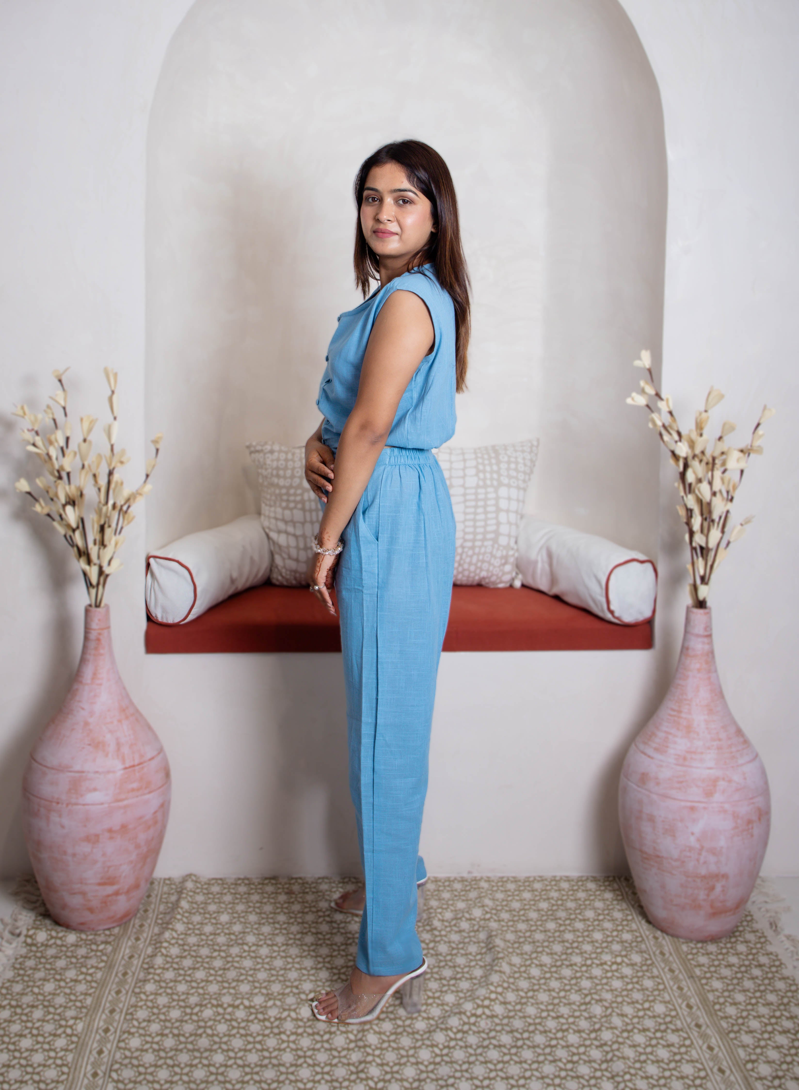 Introducing the Light Blue Co-ord Set by Mayin Clothing, crafted from 100% sustainable cotton. This stylish, sleeveless jumpsuit offers comfort and elegance with its relaxed fit and minimalist design. Perfect for any occasion, it combines effortless style with eco-friendly fashion, making it a must-have addition to your wardrobe.