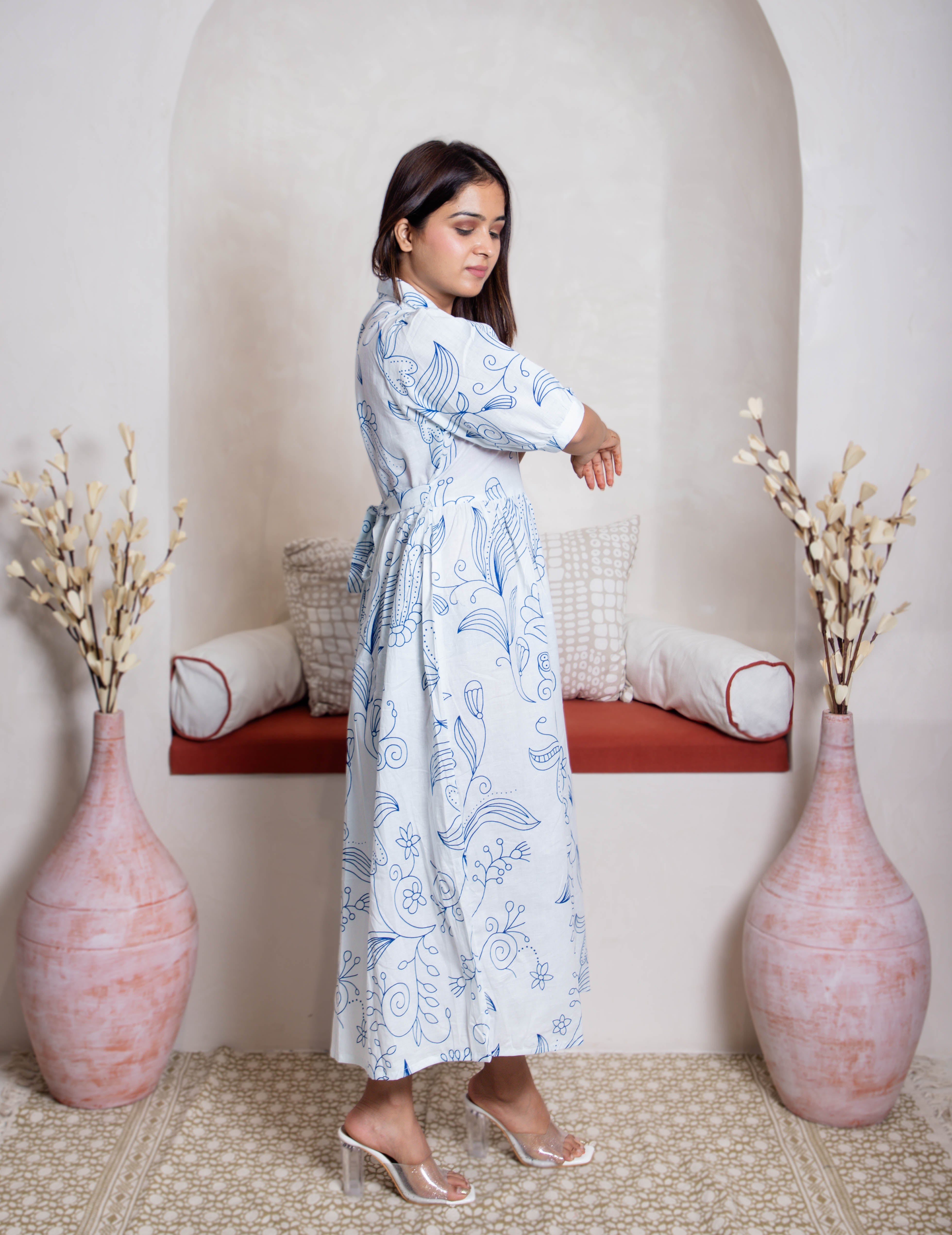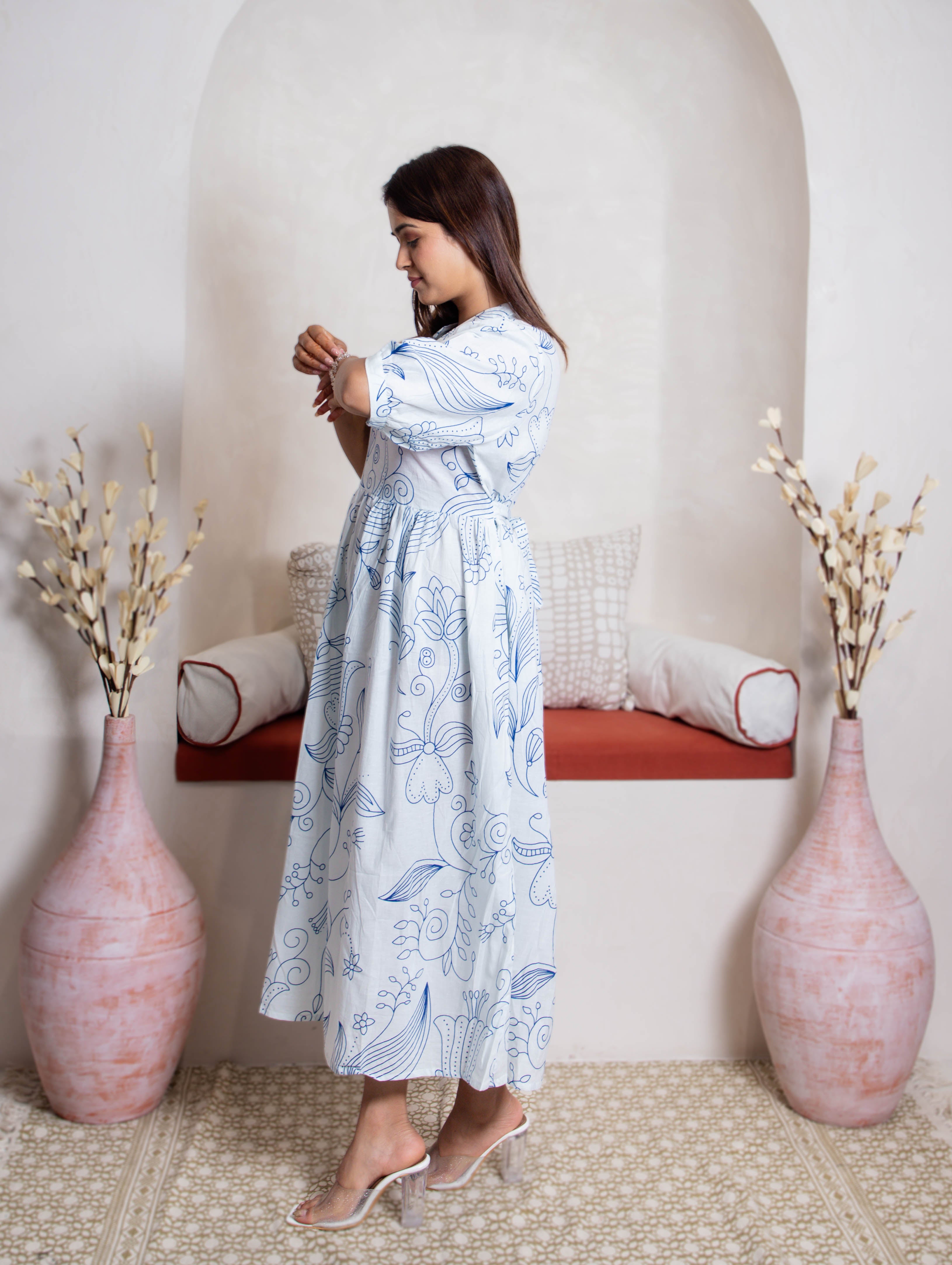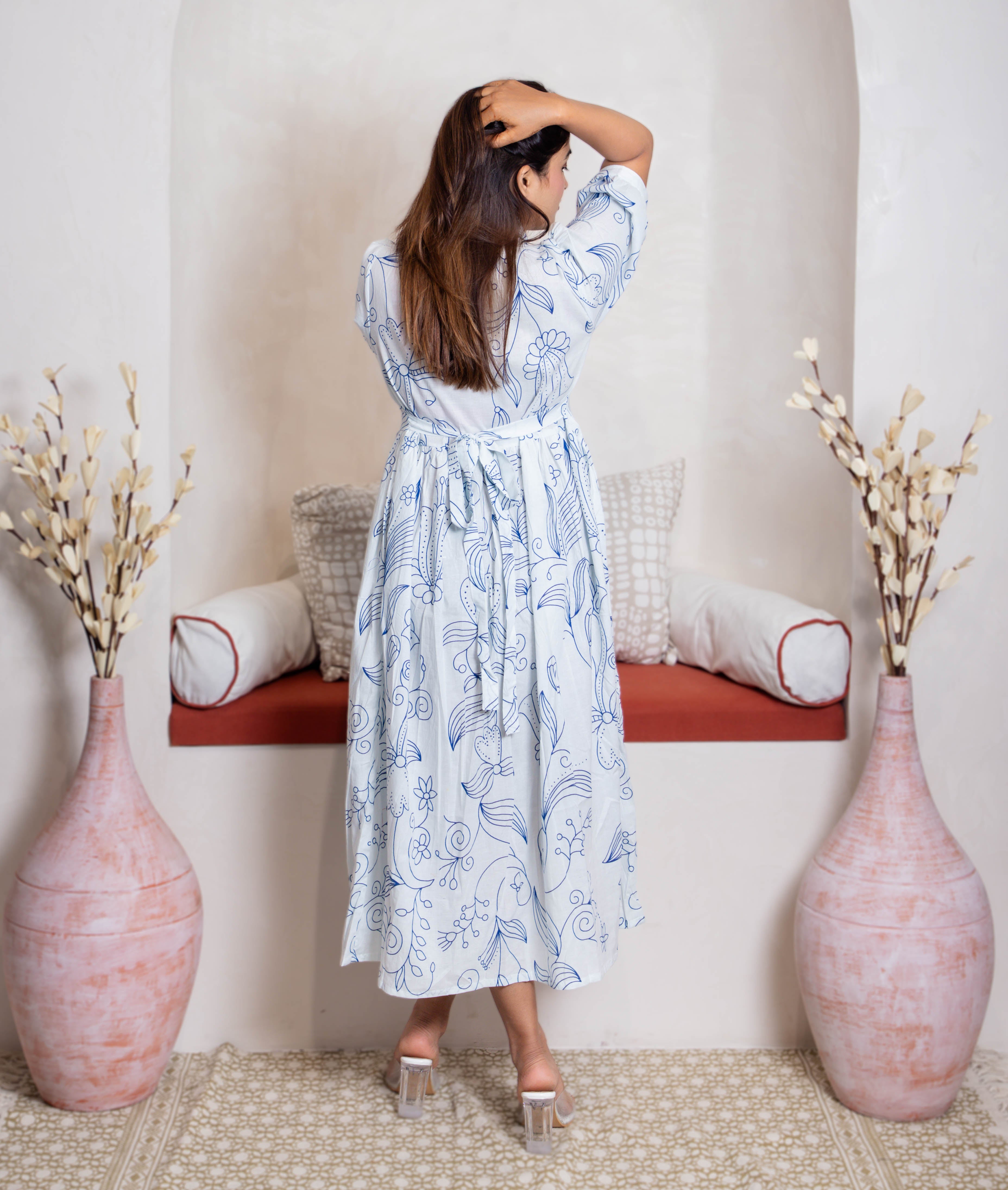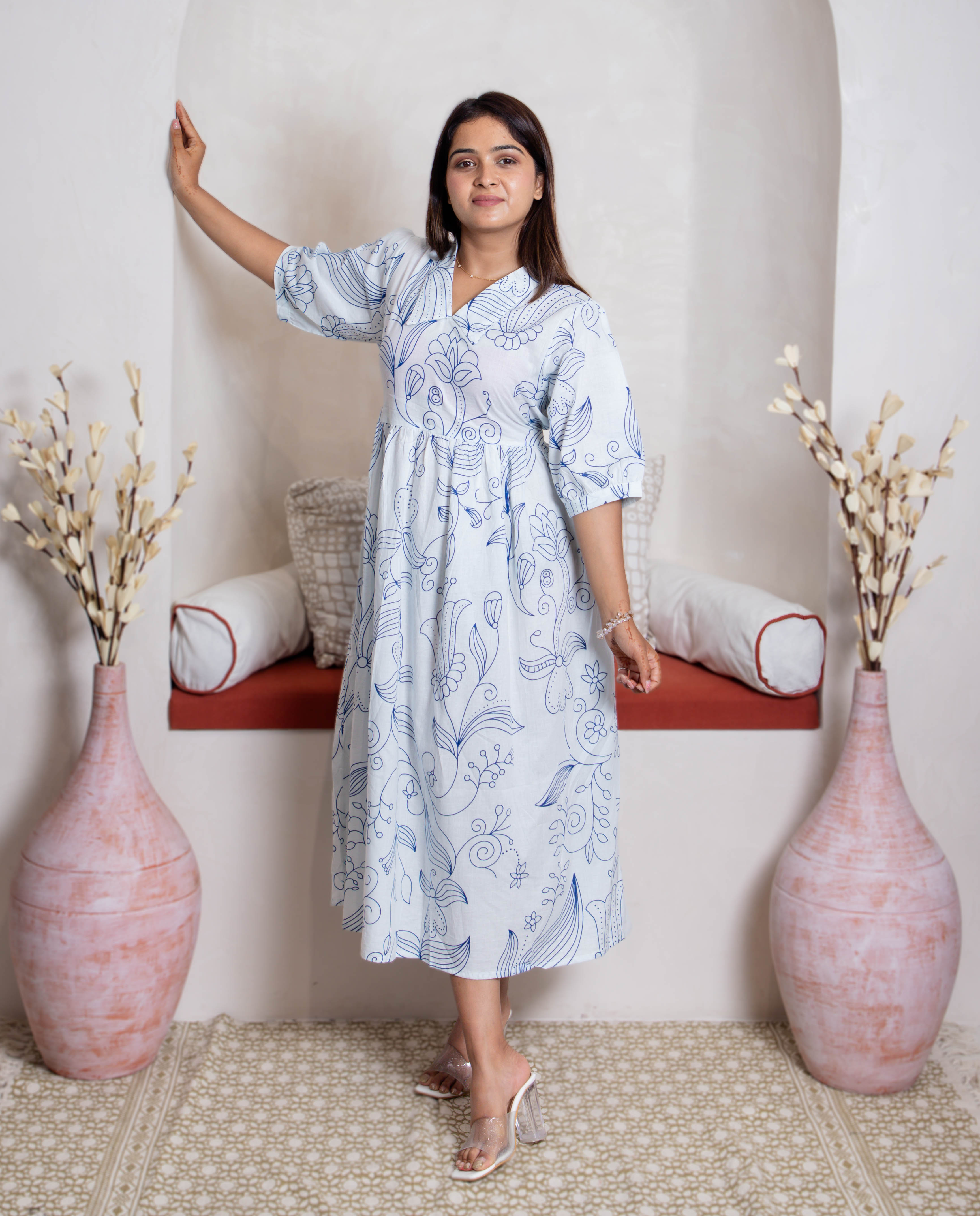 The Indigo Bluebell Dress, made from 100% cotton, exudes effortless elegance with its delicate blue floral pattern. Designed for comfort and style, this midi dress features a flattering waist tie and puff sleeves. Perfect for a casual day out or a special occasion, embrace sustainable fashion with this timeless piece.