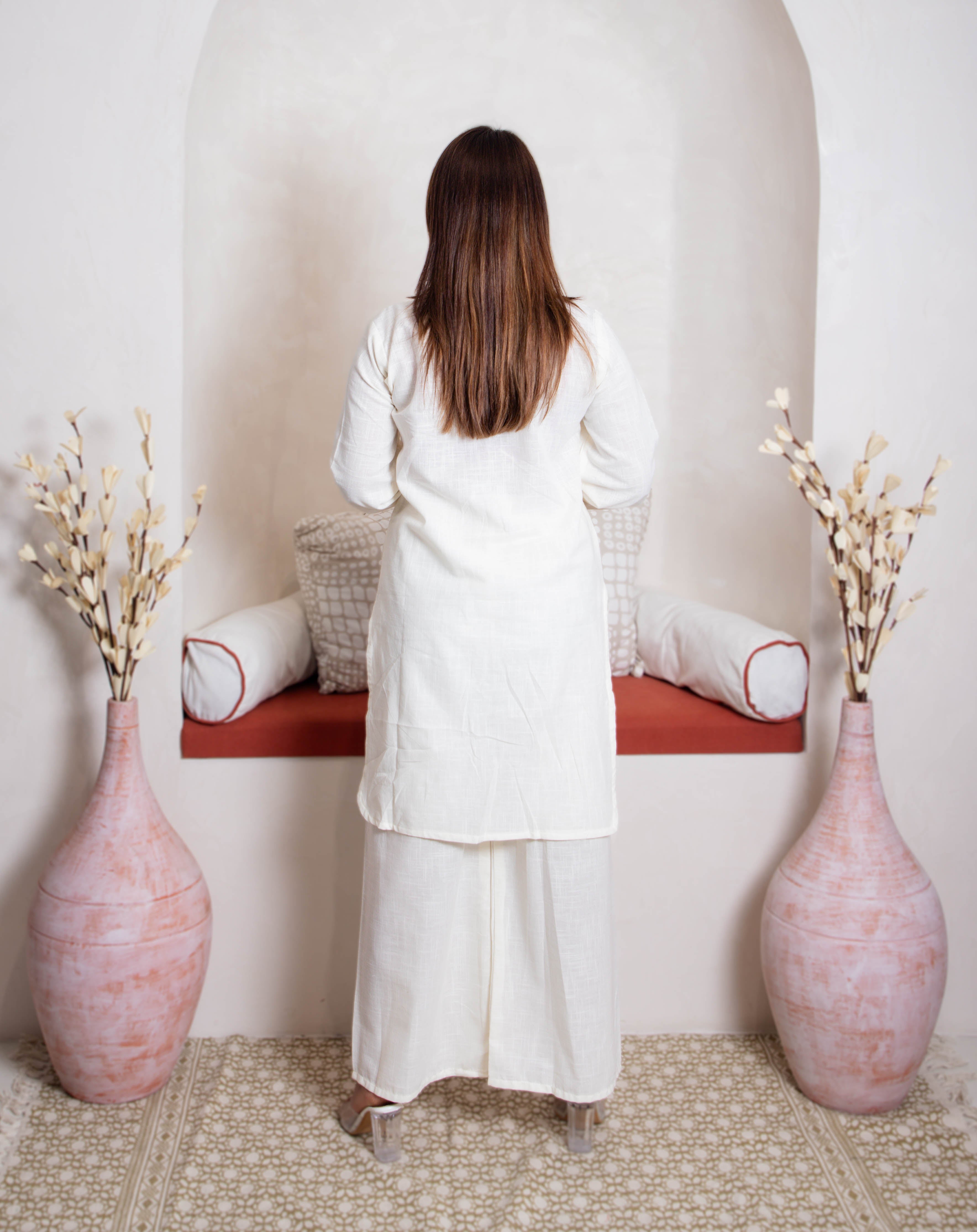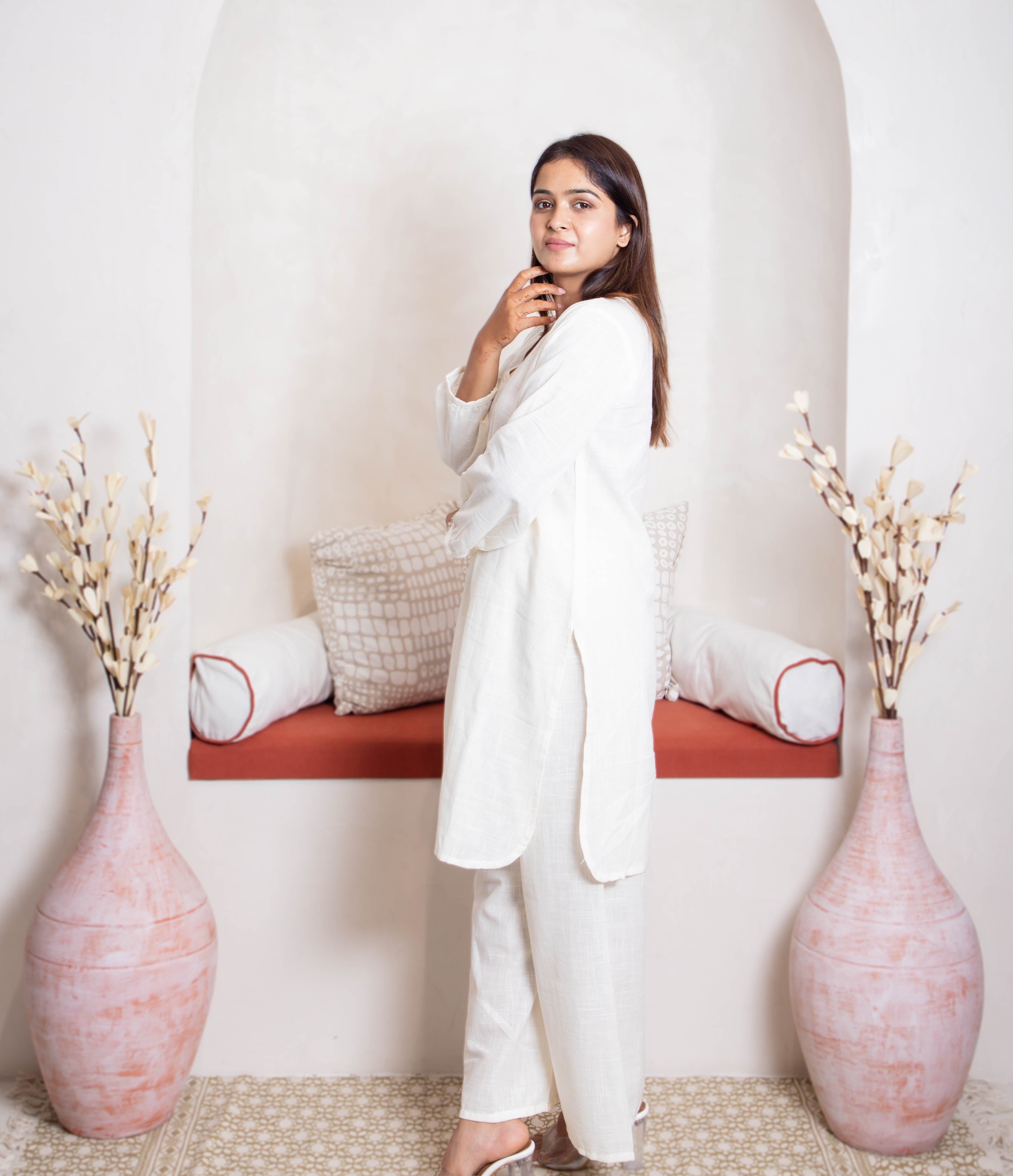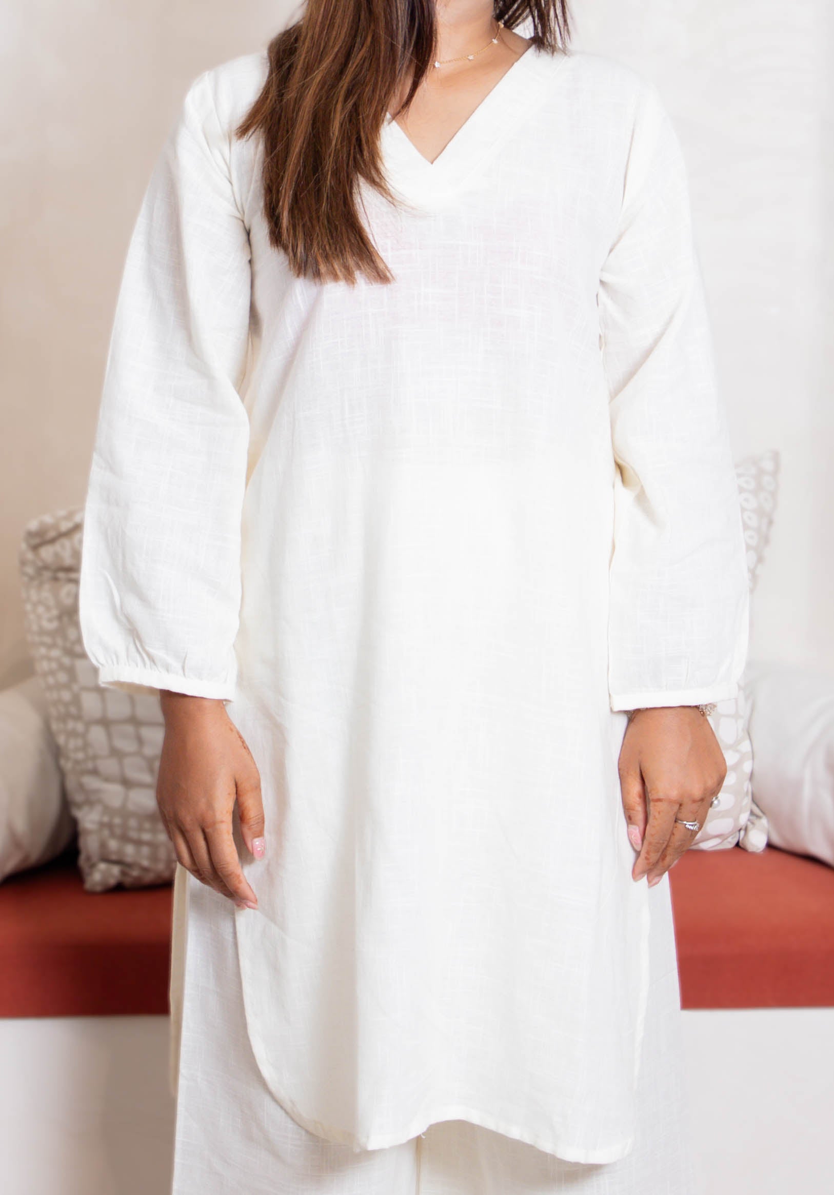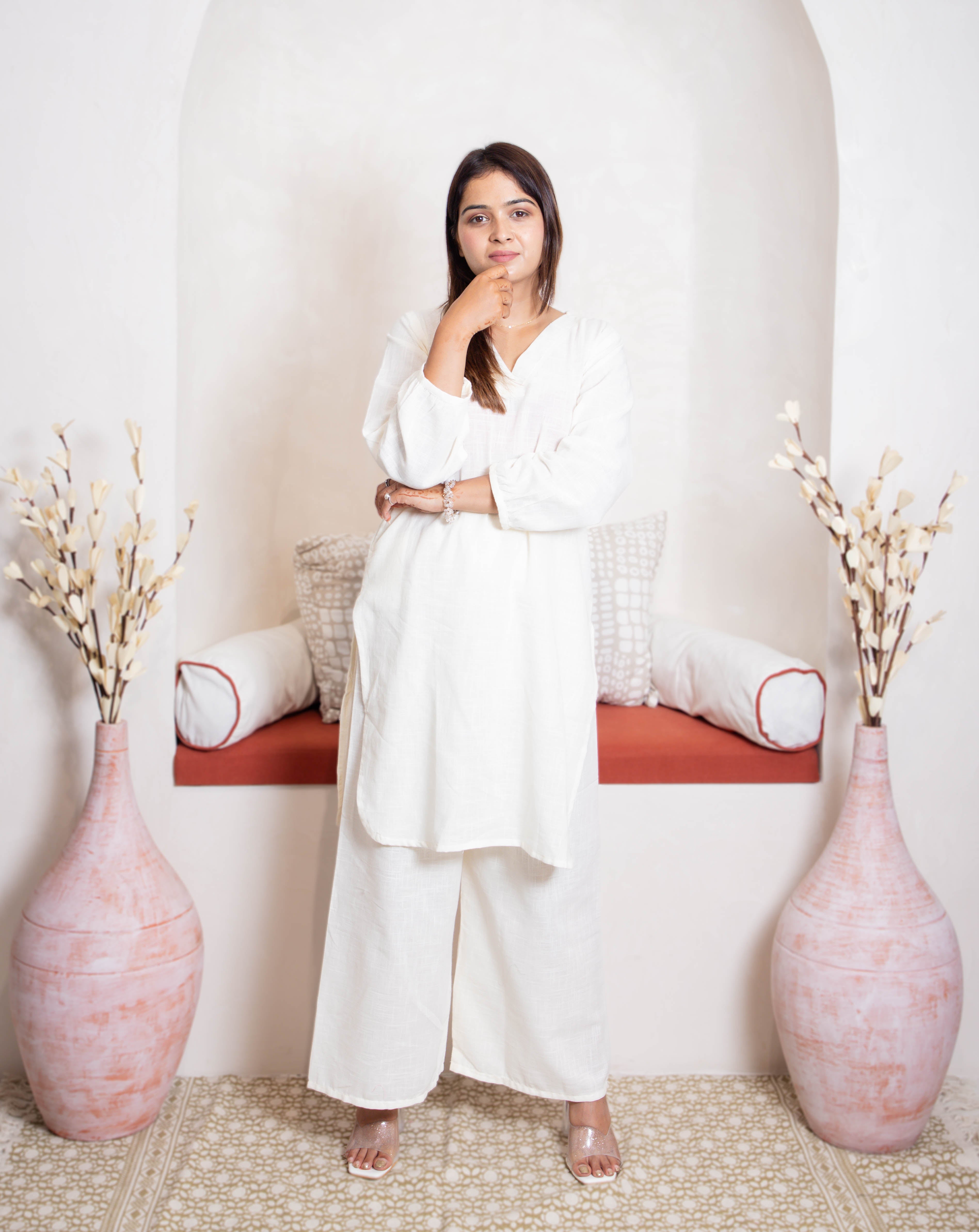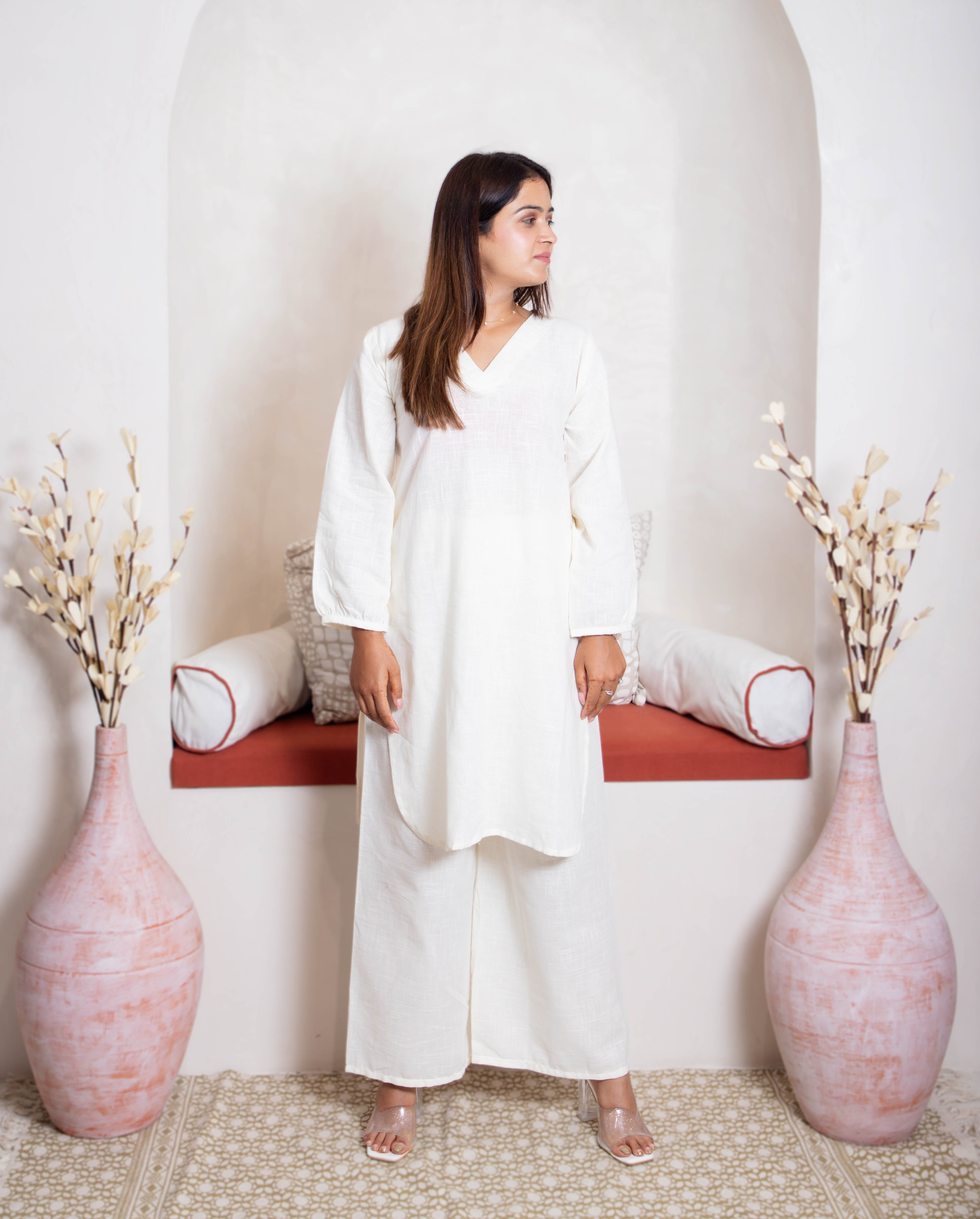Introducing the Ivory Grace set, crafted from 100% cotton for a soft, breathable feel. This elegant ensemble features a long, V-neck top with delicate sleeves and matching wide-leg trousers. Perfect for both casual and formal occasions, this timeless ivory set adds a touch of grace and sophistication to your wardrobe.