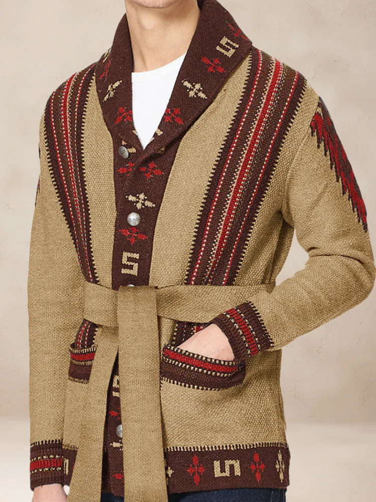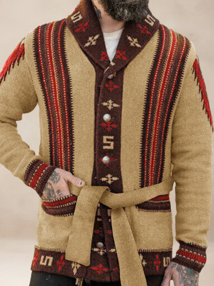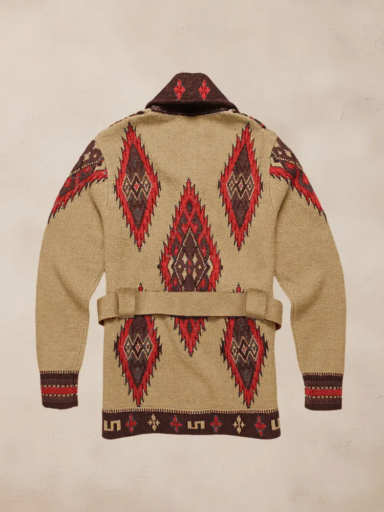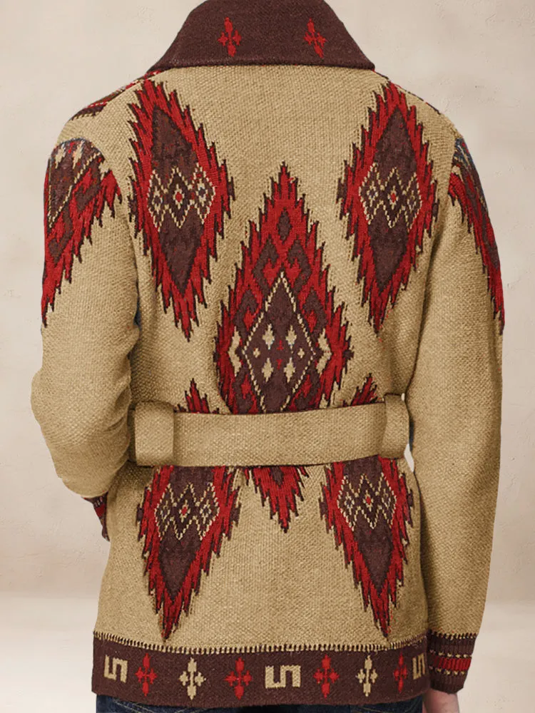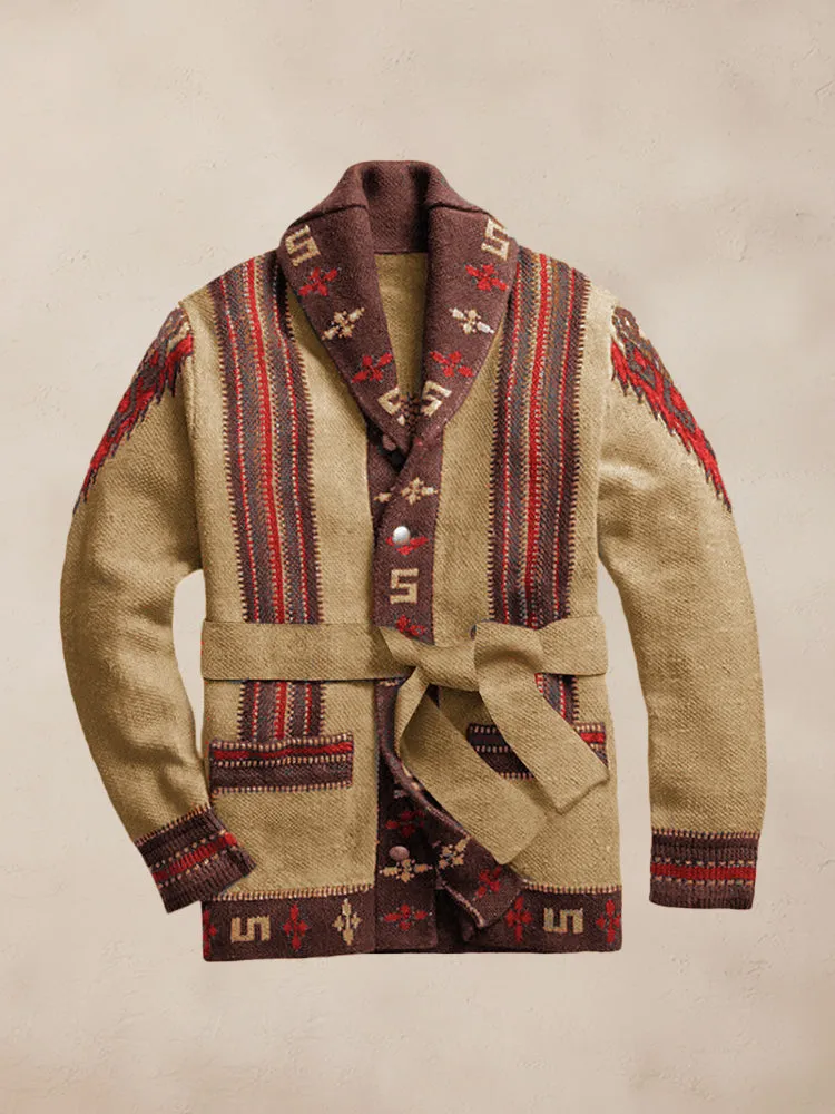 - Details: Retro jacquard pattern, 2 hand pockets, belted waist